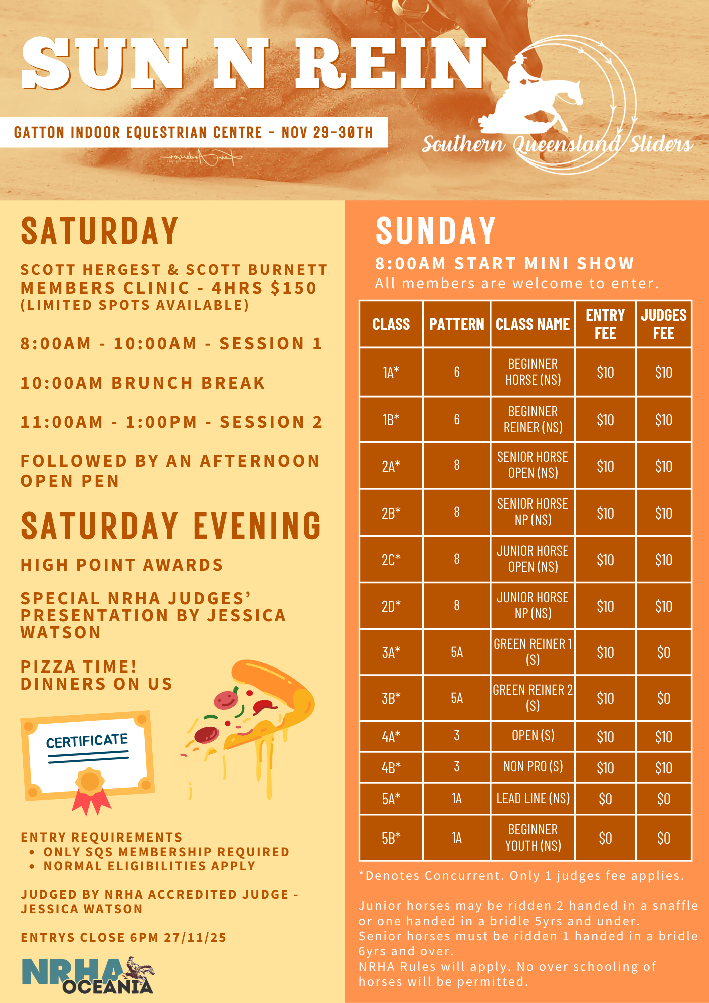 Southern Queensland Sliders Year-End Wrap-Up! We’re finishing the year with a weekend full of reining, learning, and fun! Clinic – Sat 29 Nov With NRHA trainers Scott Hergest & Scott Burnett (Limited riding spots available!) Saturday Night High Point Presentation A special NRHA Judges’ presentation by Jessica Watson on what judges look for and how scoring works Dinner’s on us – Pizza time! Sunday 30 Nov Mini Show – classes for everyone!